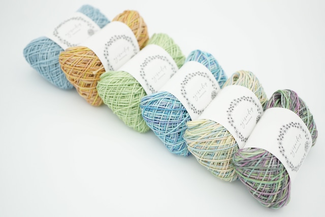 木漏れ日がゆらゆらと揺れる午後のひととき。 窓辺でお気に入りの紅茶を淹れて一息つくような、 穏やかな時間をイメージして染めたセットです。 このセットにはオリジナルの染め方、たゆたう染めが入っています。 段染めの規則的な色の変化ではなく、ランダムに色が変わっていく、色の変化をより楽しめる糸です。 染色の時に染料がたゆたう様子がとても美しく、そこからネーミングしました。 柔らかなピンクと淡いグレーとグリーンがじんわり溶け合うニュアンスカラーは落ち着きと可愛らしさが共存する色合いで春の霞の中から花が覗くような幻想的な美しさも感じます。 赤系の単色はエネルギッシュな印象だけでなく、ポップで可愛い雰囲気も残しました。 イエローは落ち着いた優しい雰囲気にしています。 段染めの2色も混色を重ねたどり着いた色合いです。 木漏れ日の中でも美しく映える、そんな6色にまとめました。 20/4 コーマ シルケット加工の糸 6巻 段染め2色、単色3色 たゆたう染め1色 1巻70メートル程度 刺し子、こぎん刺し、ダーニング、てまり、刺繍など、幅広くお使い頂ける綿糸です。 大切に染めていますが、手染めなので色ムラがあったり、糸の継ぎ目がある場合があります。 濃い色は色落ちすることが可能性としてございます。 また、染める際の枷により色の違いが見られます。 手染め、手仕事ゆえですが、ご理解いただける方にお求めいただけますと幸いです。 なるべく実物の色味をお伝えできるよう努めて撮影していますが、ブラウザの違いなどにもより、若干の違いがみられる場合があります。 ///////// Inspired by a quiet afternoon where dappled sunlight gently sways, this set was dyed to evoke a peaceful moment—like pausing by a window with your favorite cup of tea. It includes my original “Tayutau” dyeing style, where colors drift and change softly at random rather than in regular repeats, creating threads rich in subtle variation. The name comes from the beautiful way the dyes themselves seem to float and mingle during the process. Soft pink, pale gray, and green blend into nuanced, airy tones—like flowers emerging through spring haze—balancing calmness and sweetness. A red solid adds a pop of cheerful energy, while the yellow remains gentle and warm. The two variegated threads are layered blends developed through repeated color mixing. Six colors that glow softly even in sunlight.20/4*6 Combed and mercerized thread 1roll 70m It is a cotton thread that can be used for a wide range of purposes such as sashiko, kogin embroidery, darning, temari, and embroidery. ---------------- About threads Although it is carefully dyed, there may be uneven color or thread seams because it is hand-dyed. Dark colors may fade. Differences in color can also be seen depending on the shackles used during dyeing. Although it is hand-dyed and handmade, we would appreciate it if you could purchase it from someone who understands this.