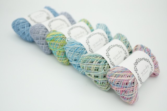 「ちがいはちから、つながりは未来。」 世界自閉症啓発デーのシンボルカラーである青に寄せて、 色と色がやわらかく連なっていく「Blue Line」と名付けたセットです。 淡いブルーから深みのある青へ、 ときにグリーンや他の色を含みながら、 それぞれの色が自然に隣り合い、ひとつの流れをつくります。 はっきりとした境界ではなく、 ゆるやかに溶け合いながら続いていく色の重なり。 そのつながりは、まるで一本の線のように、 静かに、そして確かに、未来へと続いていきます。 ひとつひとつの違いが、やがて美しい調和となるように。 一針一針、そのやさしいつながりを感じながら お使いいただけたら嬉しいです。 ※「ちがいはちから、つながりは未来。」は今期の世界自閉症啓発デーのテーマです。 https://www.worldautismawarenessday.jp 20/3 コーマ シルケット加工の糸 6巻 段染め1色、単色2巻、たゆたう染め3巻 刺し子、こぎん刺し、ダーニング、てまり、刺繍など、幅広くお使い頂ける綿糸です。 大切に染めていますが、手染めなので色ムラがあったり、糸の継ぎ目がある場合があります。 濃い色は色落ちすることが可能性としてございます。 また、染める際の枷により色の違いが見られます。 手染め、手仕事ゆえですが、ご理解いただける方にお求めいただけますと幸いです。 なるべく実物の色味をお伝えできるよう努めて撮影していますが、ブラウザの違いなどにもより、若干の違いがみられる場合があります。 ///////// Bathed in spring light, in the breeze— this vibrant set captures that joyful scene in thread. The variegated threads reflect the colors of spring flowers and new buds in vivid tones. Both sparkle threads use gold glitter, evoking dewdrops shimmering on delicate petals—like cherry blossoms and rapeseed flowers in bloom. The pink sparkle thread is variegated in soft pink shades inspired by sakura. I paired them with a versatile gray that blends beautifully with all the colors—softening the sweetness of pink and yellow or gently framing your stitching. A bright, graceful celebration of spring. 20/3*4 Combed and mercerized thread 20/3*2 Metallic thread 1roll 70m It is a cotton thread that can be used for a wide range of purposes such as sashiko, kogin embroidery, darning, temari, and embroidery. ---------------- About threads Although it is carefully dyed, there may be uneven color or thread seams because it is hand-dyed. Dark colors may fade. Differences in color can also be seen depending on the shackles used during dyeing. Although it is hand-dyed and handmade, we would appreciate it if you could purchase it from someone who understands this.