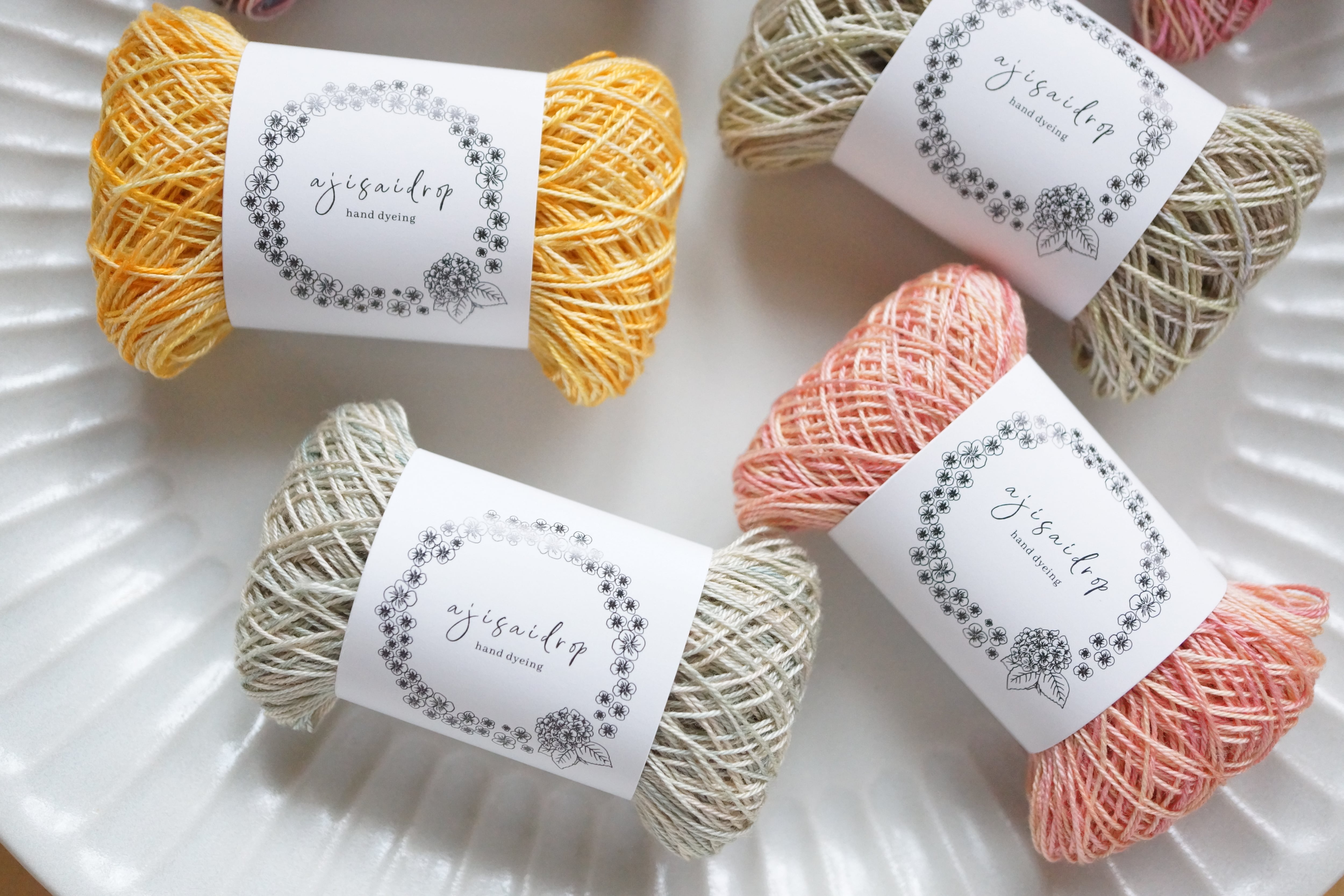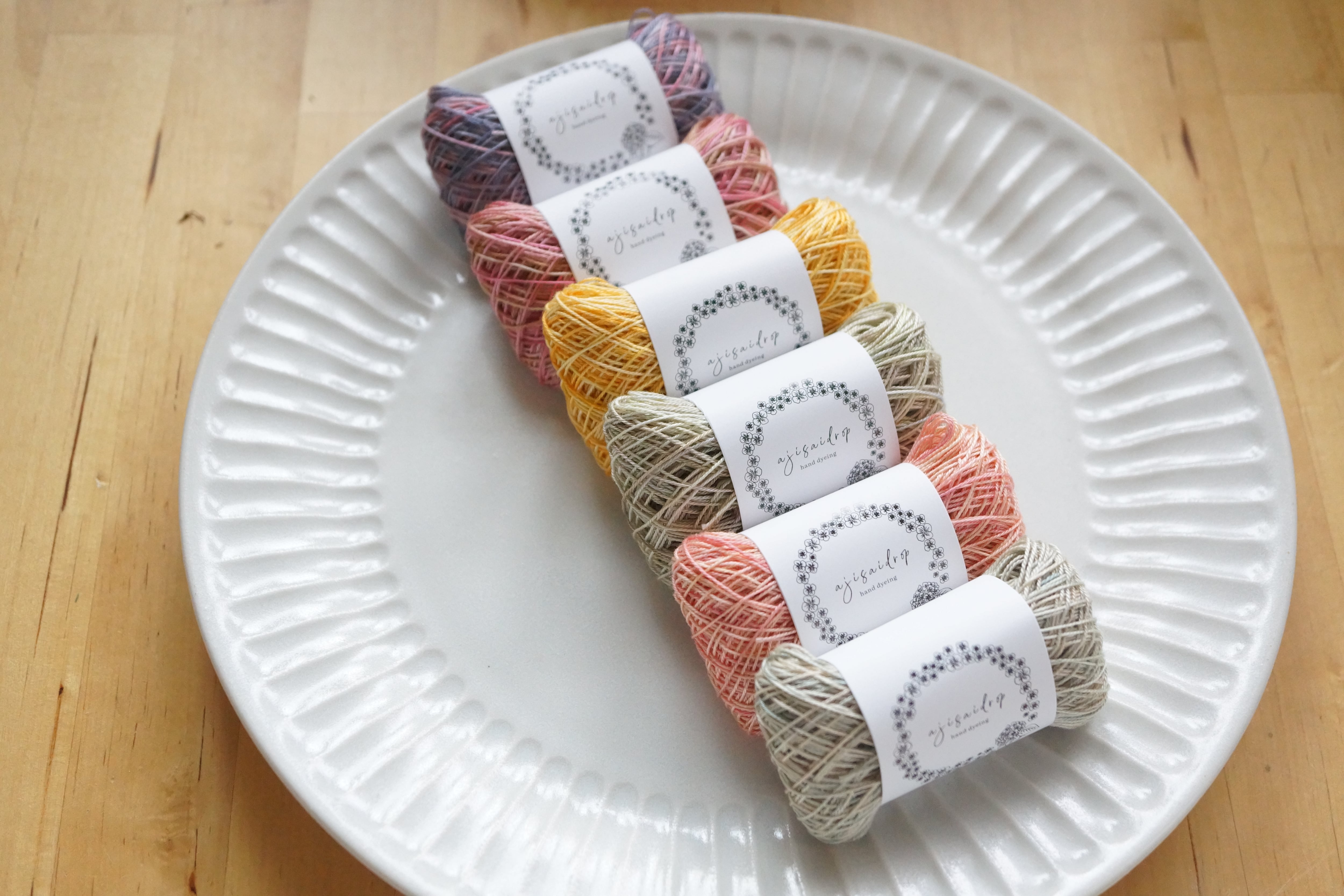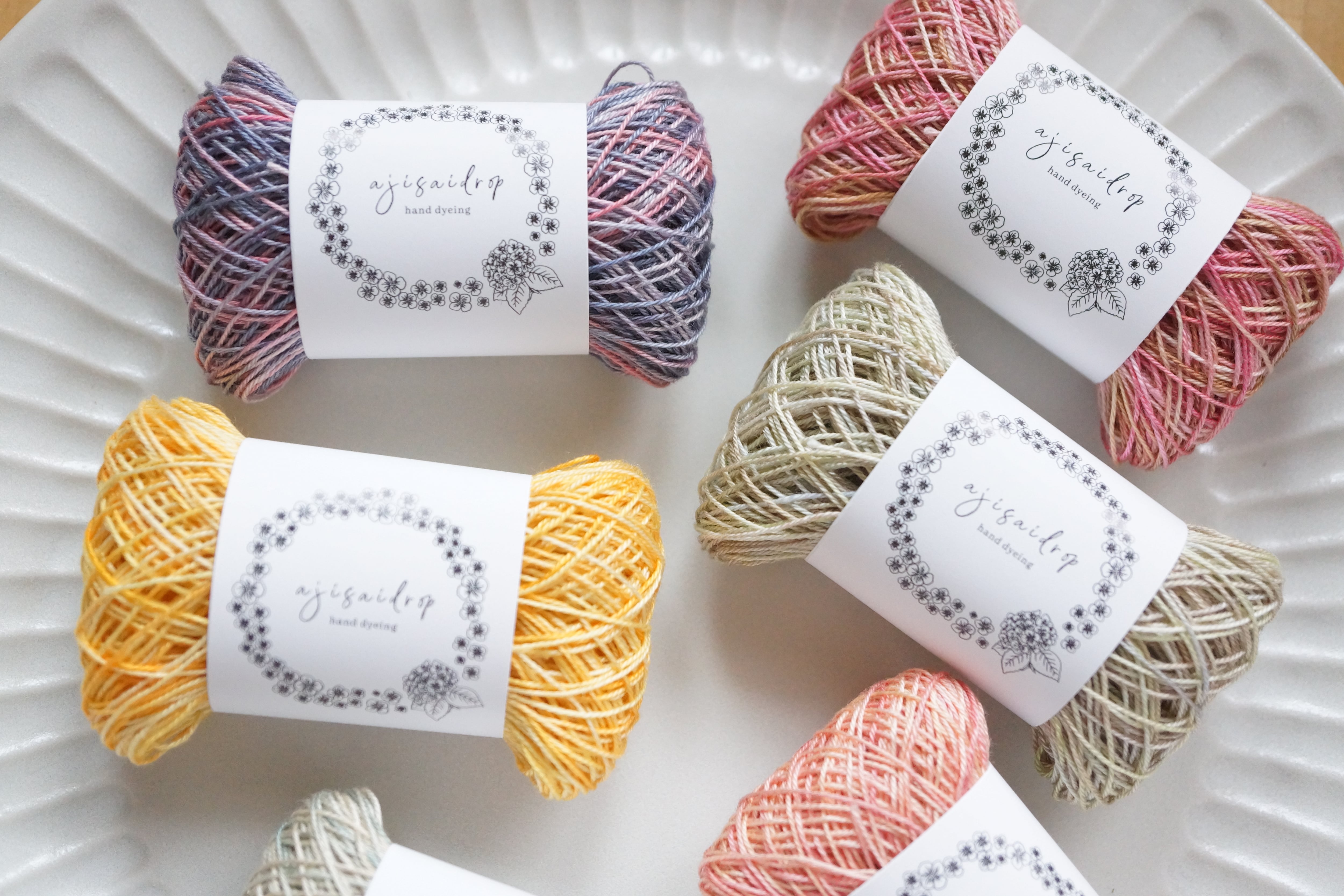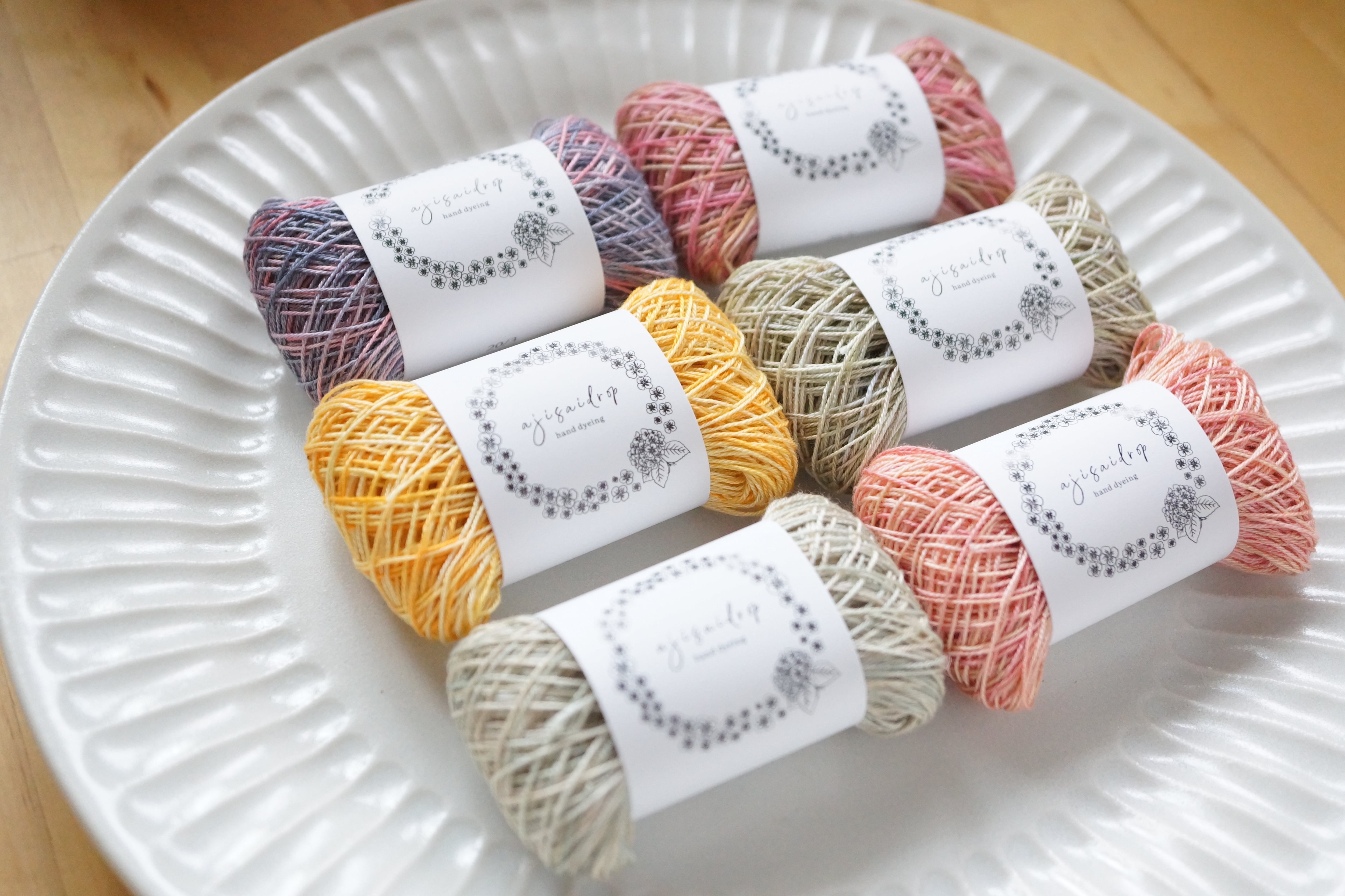 This thread set is dyed with ajisaidrop’s original “Tayutau-zome” technique.