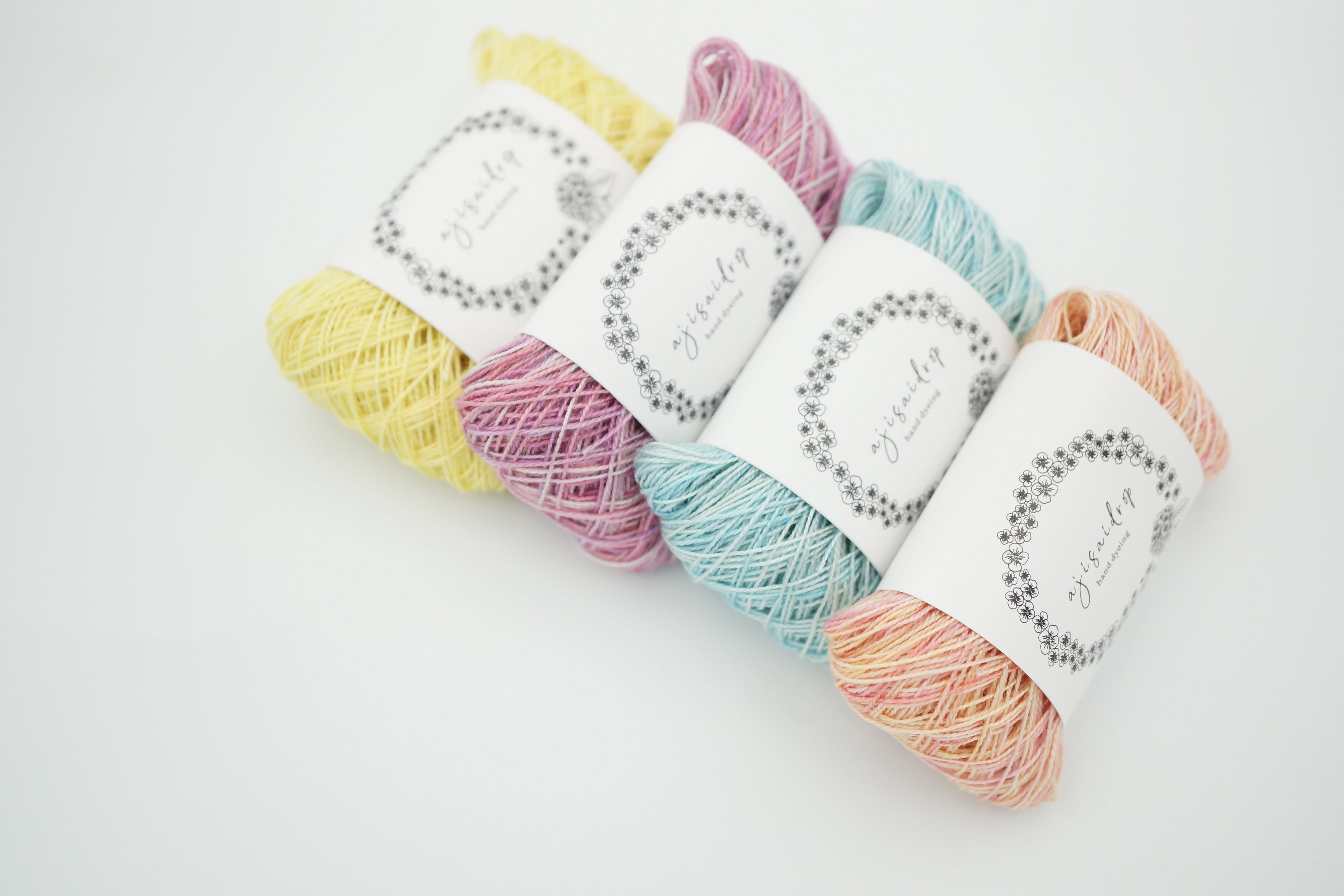 段染め2巻 単色1巻 ブルーの糸は二度染めをしていて、単色のブルーに濃いブルーを雫のように落として染めています。
