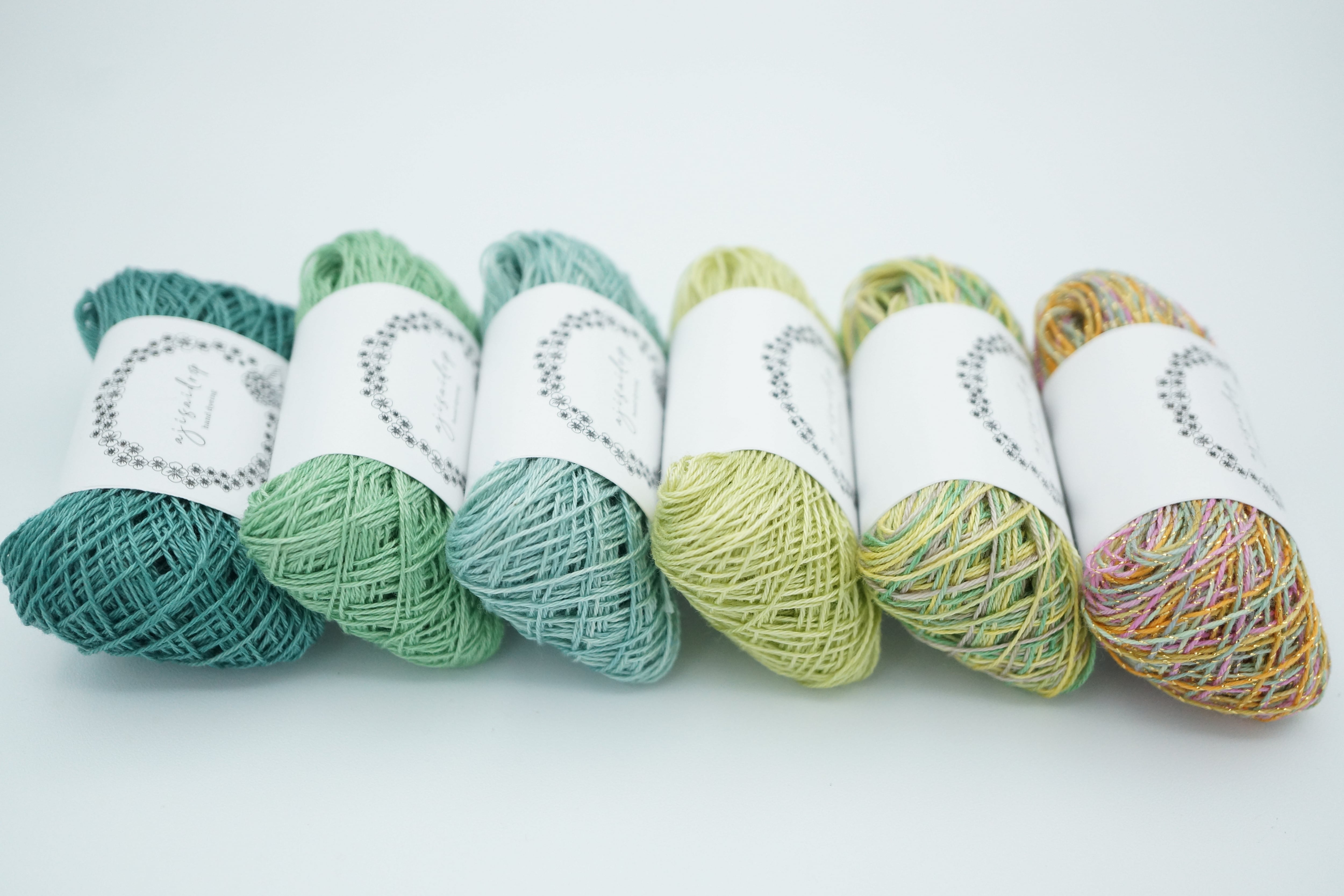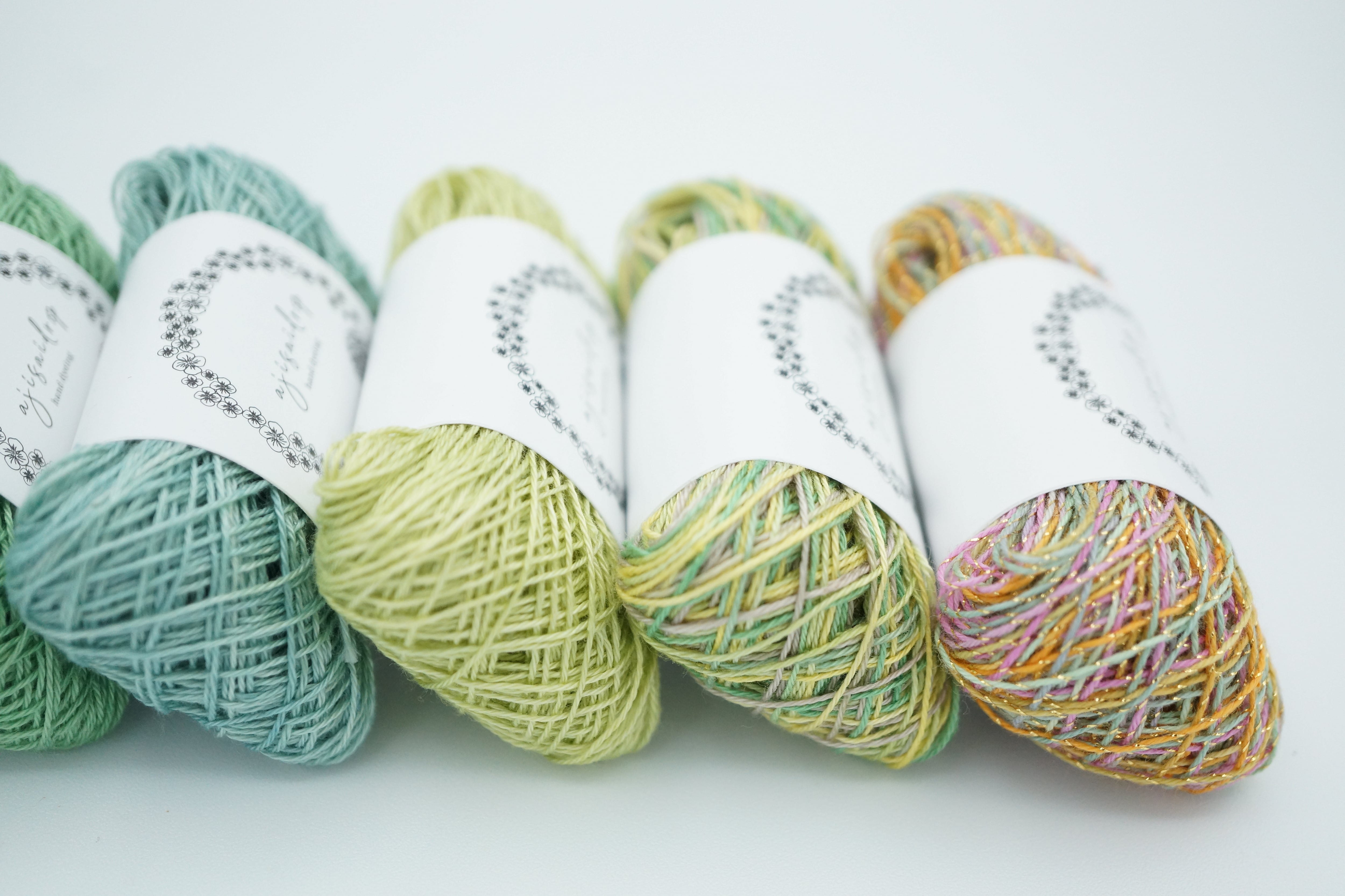 濃淡の様々なグリーンに、多色感のある段染めとラメ糸を加えています。